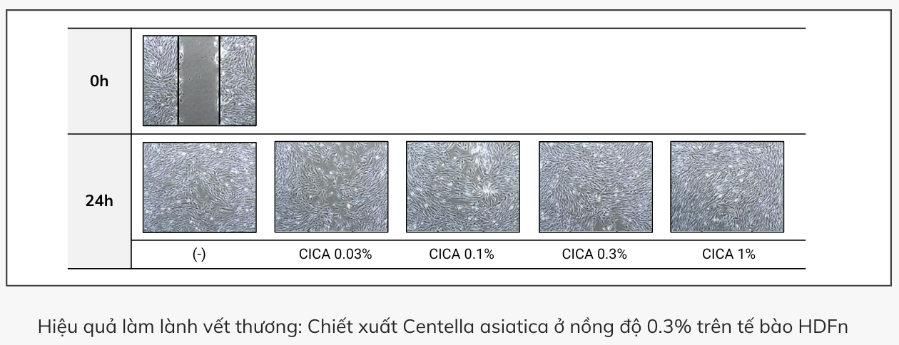 ● Centella asiatica 0.3% cho thấy hiệu quả phục hồi cao trên tế bào HDFn.