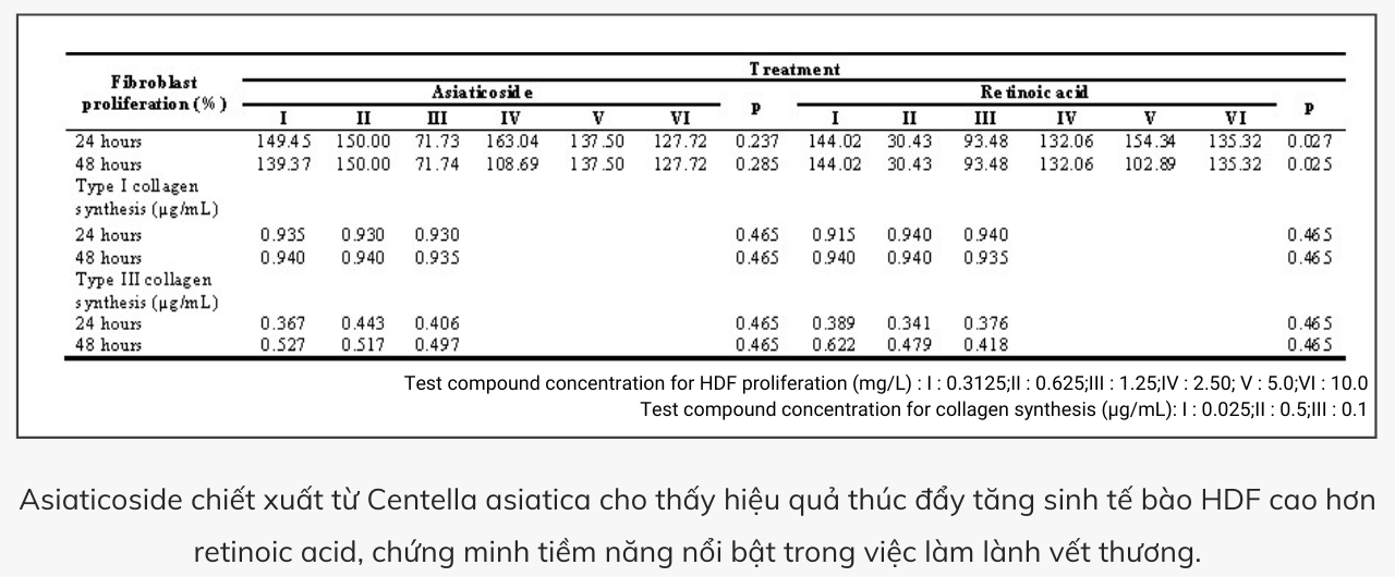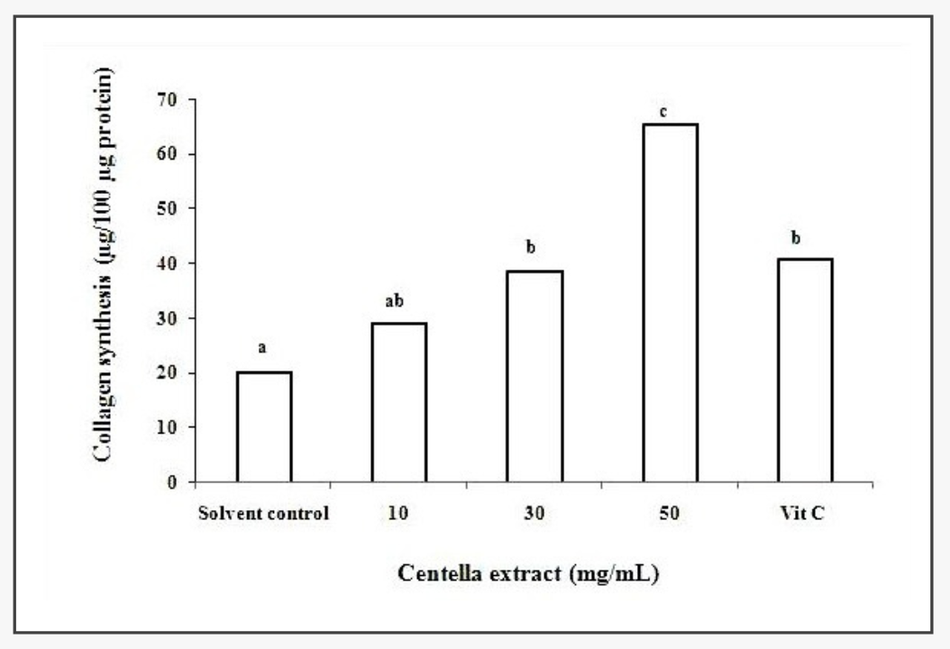 ● Chiết xuất Centella asiatica thúc đẩy tổng hợp collagen phụ thuộc nồng độ.