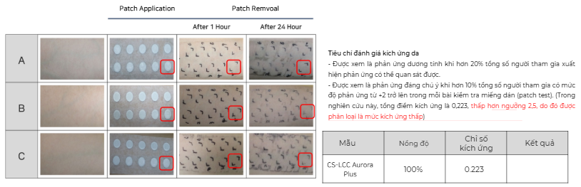 Nghiên cứu trên 23 tình nguyện viên Hàn Quốc, sử dụng sản phẩm chứa 5% Cs Lcc Aurora Plus 3 lần/ngày trong 1 tuần và 2 tuần.