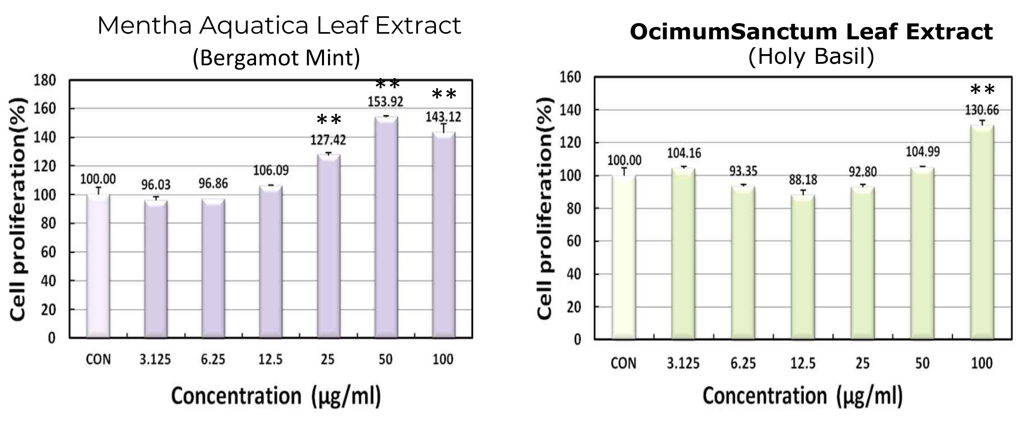=> Chiết xuất từ Bergamot Mint, Holy Basil và Noni có khả năng tăng sinh đáng kể tế bào sừng, từ đó giảm rụng và tăng số lượng tóc.