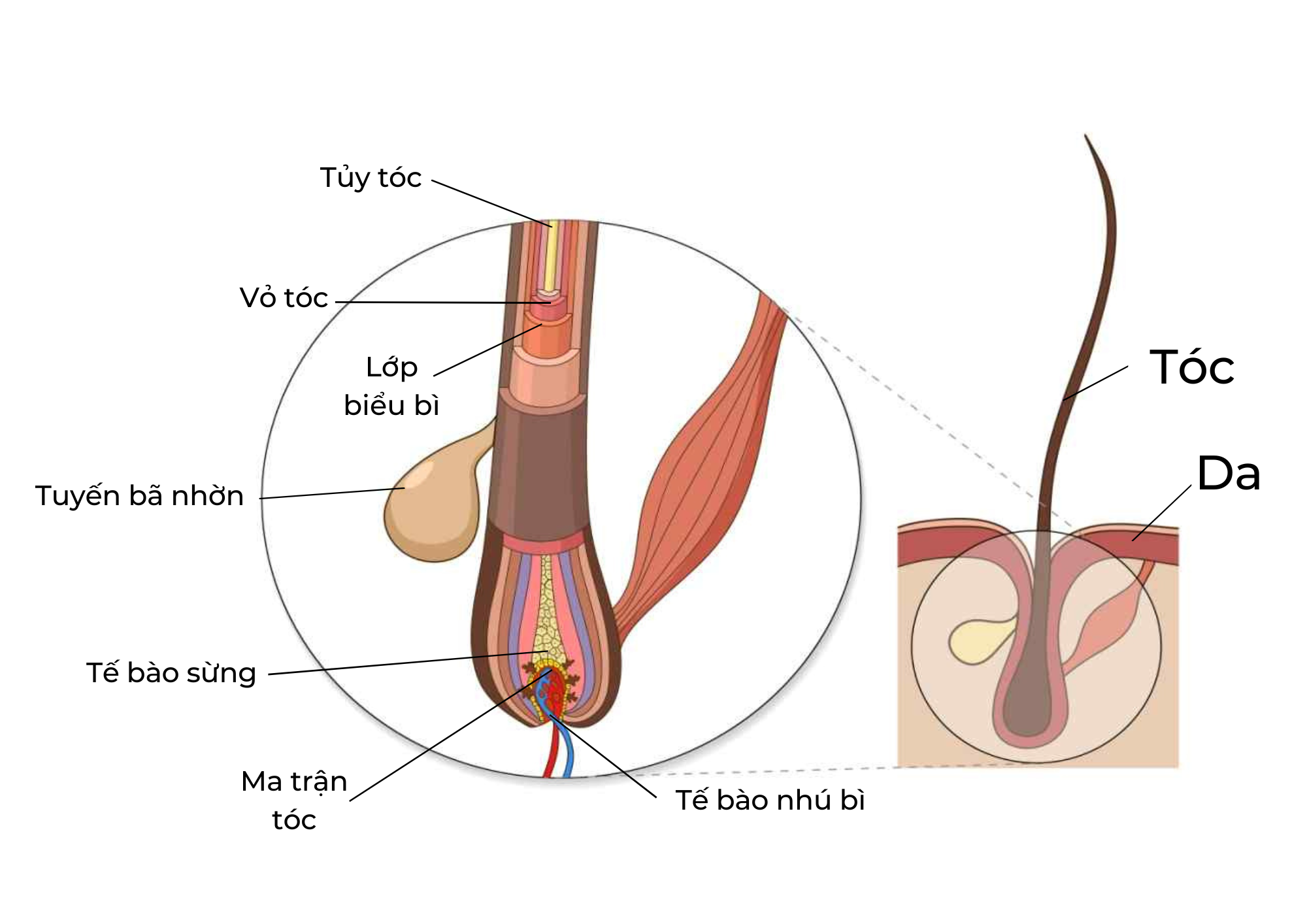 Tế bào sừng hấp thụ dưỡng chất từ mao mạch dưới nang tóc để phát triển.