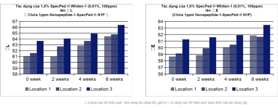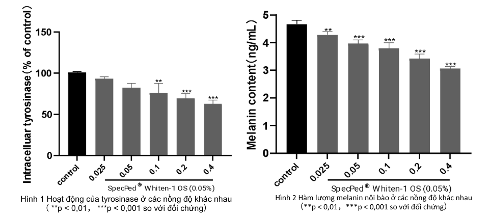=> Đối với nhóm thử nghiệm 0.4% tỷ lệ ức chế hoạt động của tyrosinase là 37,2% và tỷ lệ ức chế sự hình thành melanin là 34,3% tác dụng ức chế phụ thuộc vào nồng độ. SpecPed® Whiten-1 OS(0.05%) có thể ức chế hoạt động của tyrosinase và hàm lượng melanin trong tế bào hắc tố