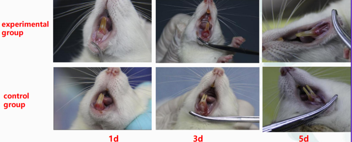 => Hiệu quả của RegeSi trong phục hồi viêm nướu trên mô hình chuột. Kết quả cho thấy từ ngày 1 đến ngày 5, tình trạng viêm giảm rõ rệt và mô nướu phục hồi nhanh chóng. Trong khi đó, nhóm đối chứng vẫn còn viêm và hồi phục chậm hơn
