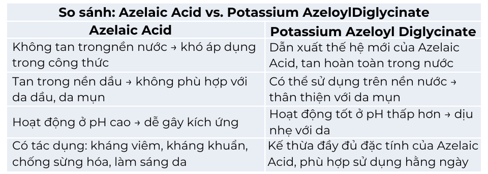 => Azelaic Acid là một hoạt chất nổi bật với các tác dụng kháng viêm, làm sáng da và hỗ trợ điều trị mụn. Tuy nhiên, do không tan trong cả nước lẫn dầu, cần sử dụng ở nồng độ cao mới đạt hiệu quả, làm giảm tính thẩm mỹ của công thức, nhiệt độ nóng chảy cao: 98- 106oC -> Azelaic Acid gây khó khăn trong việc ứng dụng vào các công thức mỹ phẩm có tính thẩm mỹ cao và linh hoạt.