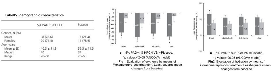 ◆ Ngoài ra, mức tăng độ ẩm lớp sừng ở nhóm 5% PAD + 1% HPCH cao hơn đáng kể so với nhóm giả dược.