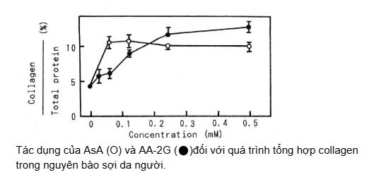 => Kết luận: Ascorbyl Glucoside kích thích quá trình tổng hợp collagen trong các tế bào nguyên bào sợi nuôi cấy và tăng cường sản xuất kháng thể trong các tế bào lách nuôi cấy. Trong 24 ngày đã tăng trưởng tế bào gấp ba lần so với nhóm đối chứng.