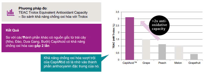 So với các chiết xuất từ nho, đào, dưa gang, bưởi – CapilAcid™ có khả năng chống oxy hóa gấp 2 lần.