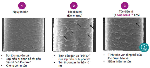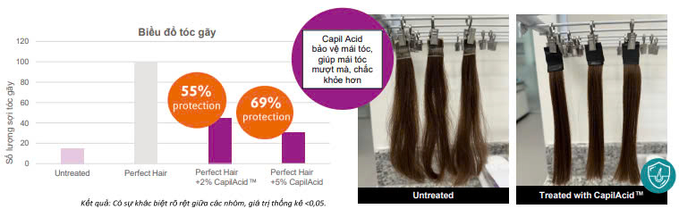 Ở nồng độ 2%, CapilAcid™ giúp giảm 55% hư tổn do các tác nhân vật lý và hóa học gây ra (duỗi tóc, nhiệt độ cao, chải tóc nhiều lần…).